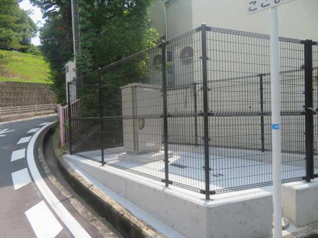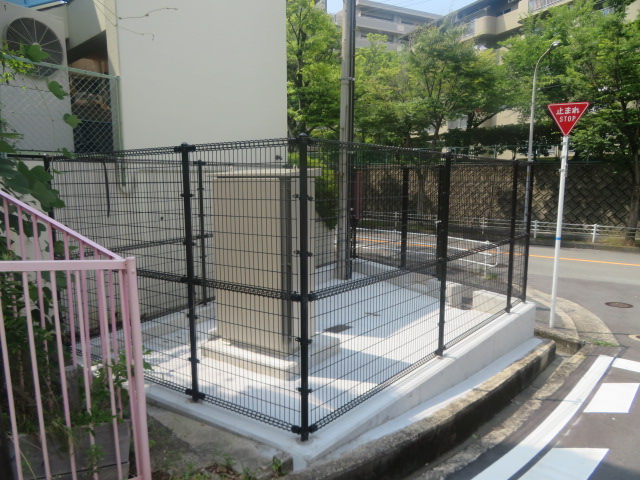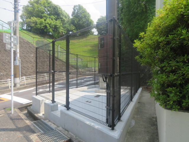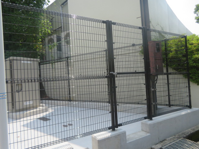 | 水道設備の周囲に、朝日スチール・UNフェンスH2400(UN-A2400-40)、片開門扉を設置しました。 |