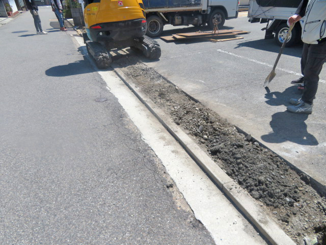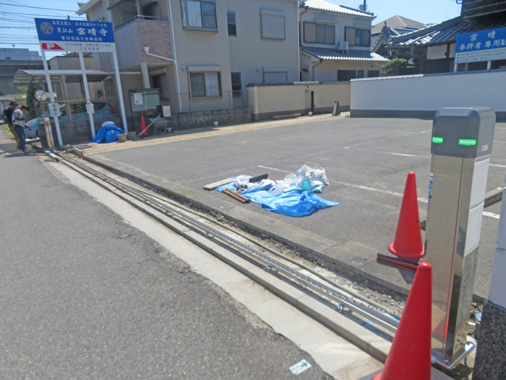 | 施設の駐車場の出入り口の既存のバリカーを撤去し、間口が14mあった為、サンポール・オートサンバリカー14m特注仕様を設置しました。施工中は車が出入りできるように鉄板を敷き施工しました。片側の柱の周りは車が接触しないようにバリカーを設置し、保護しております。 |