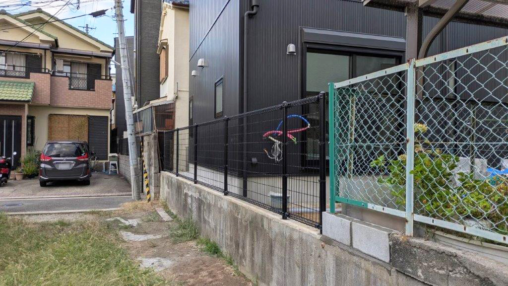 | 住宅の擁壁上に朝日スチール・UNフェンスH1200(UN-A1200)を設置、隣接する隣のブロックが破損していた為、撤去、ブロック新設、ネットフェンスを補修一部新設しました。 |