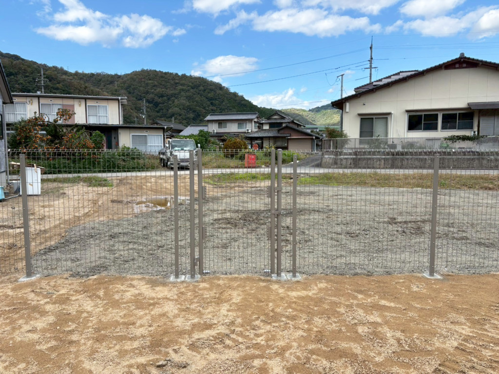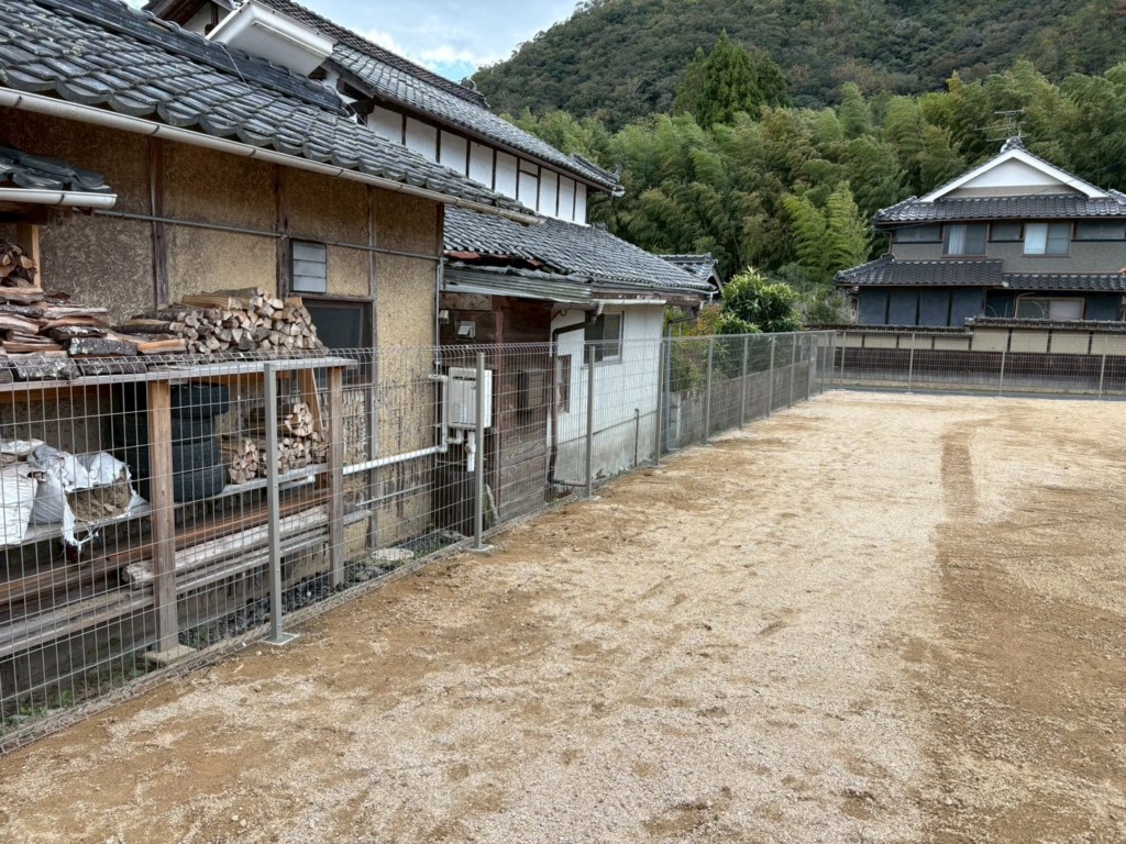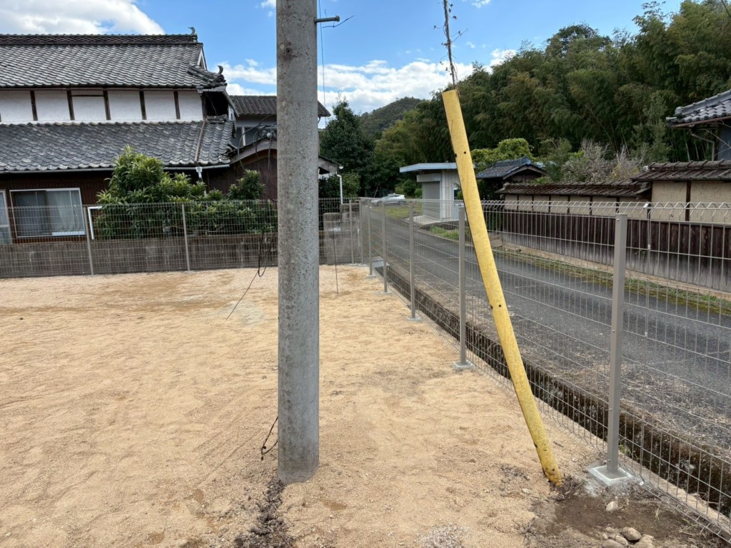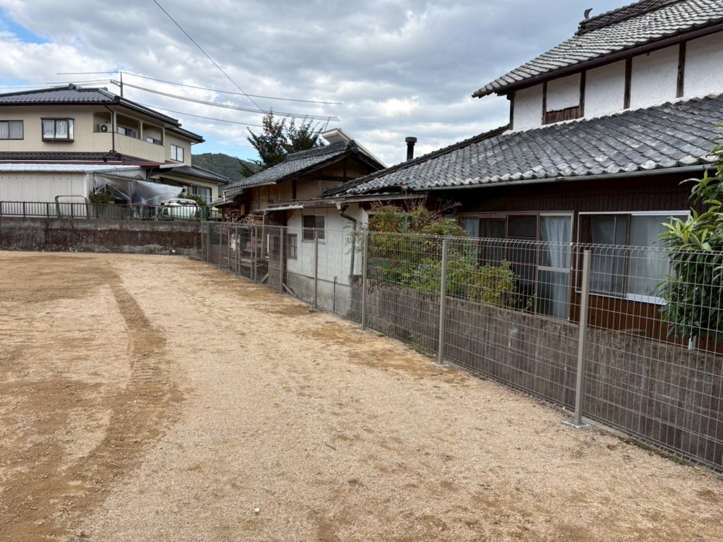 | 住宅の庭の仕切り、境界部分にメッシュフェンスH1500を設置、片開門扉も1ヶ所設置しました。 |