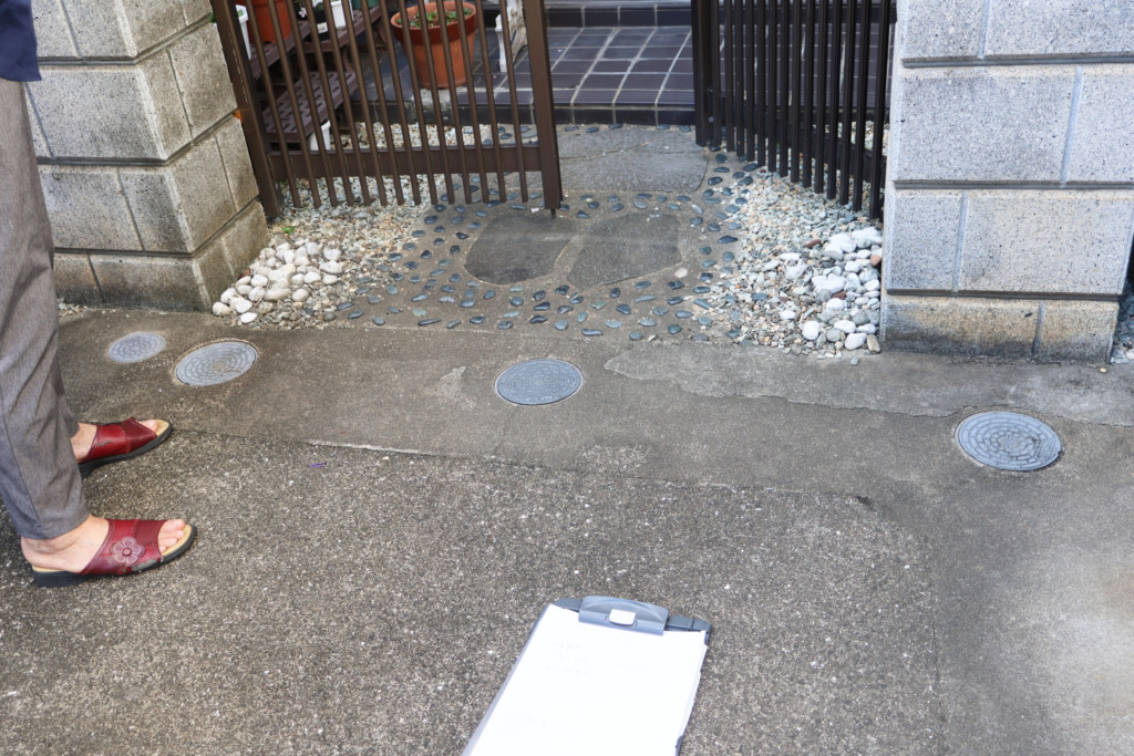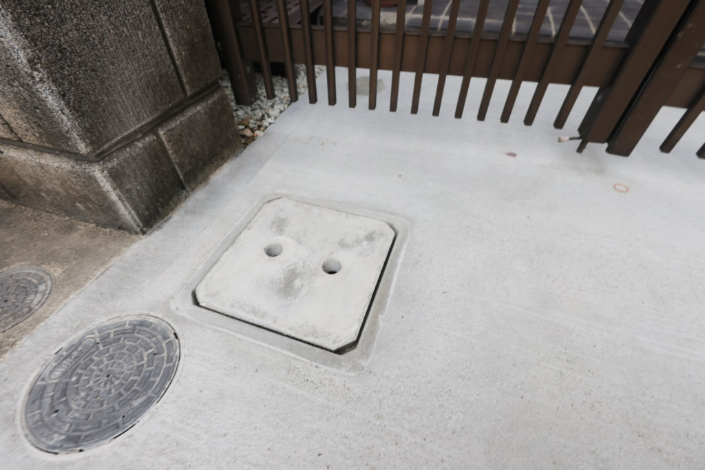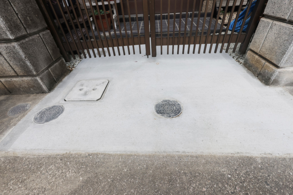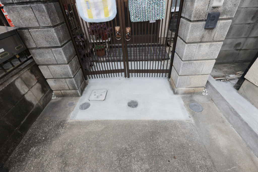 | 玄関前の門扉部分が勾配がなく、雨が降ると水が溜まるとの事で、土間を斫り、会所を設置、汚水に繋げ、勾配を取ってモルタルを打設しました。 |