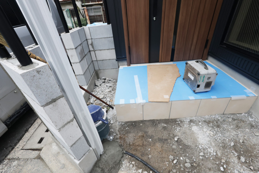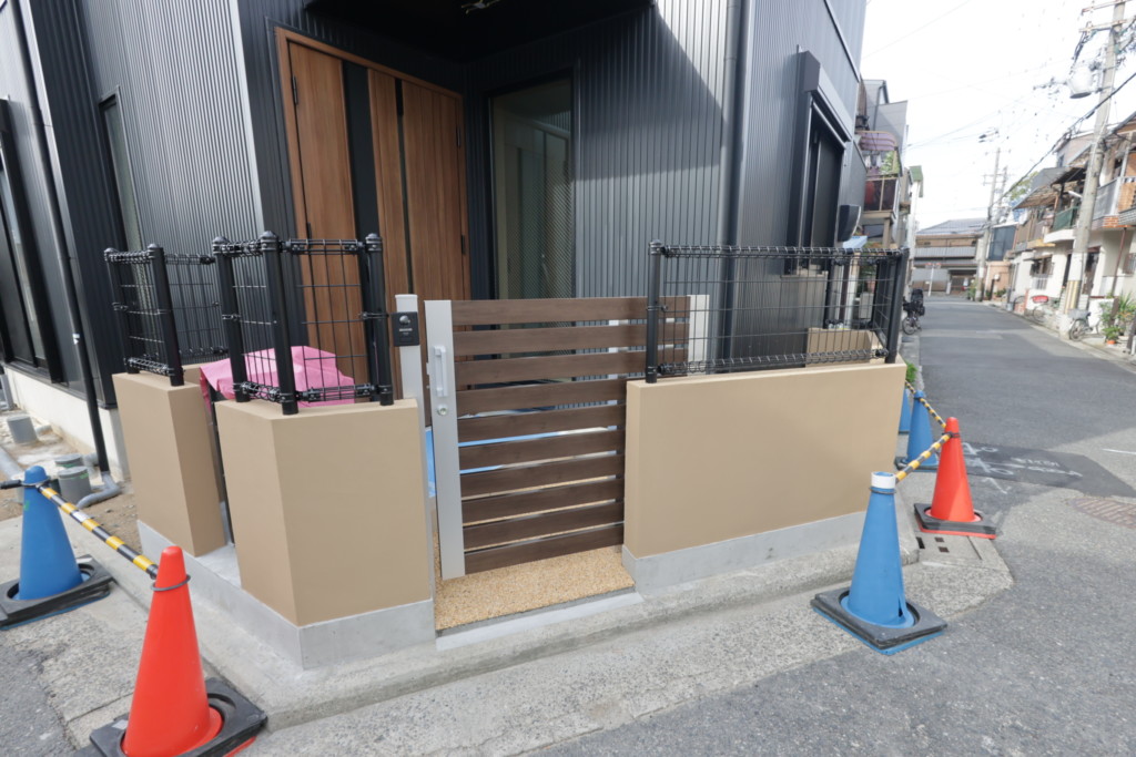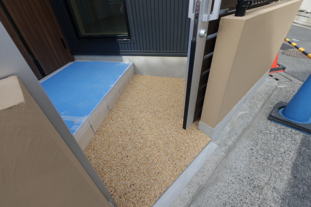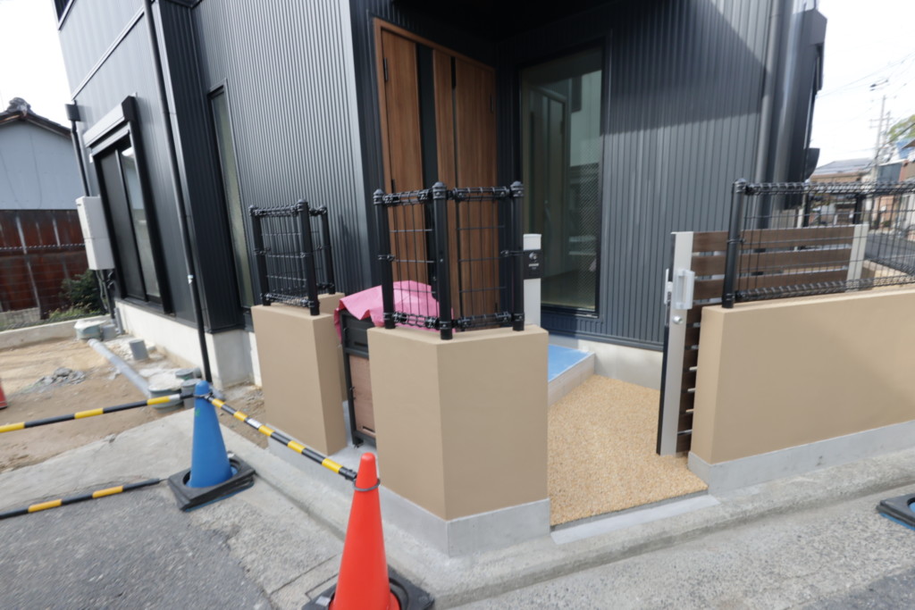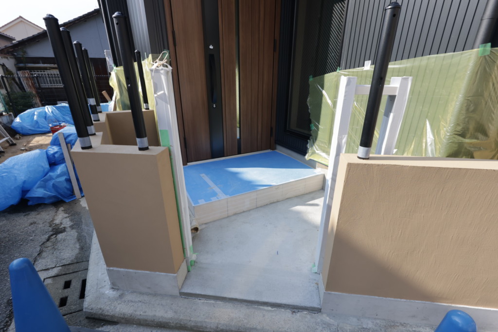 | 新築戸建て住宅の玄関廻りにブロック積み、四国化成・パレットHGで左官工事・上には朝日スチールUNフェンス設置、土間はコンクリート打設・リンクストーンFを塗り、門扉は三協アルミ・スライド門扉レナードM3型を設置しました。 |