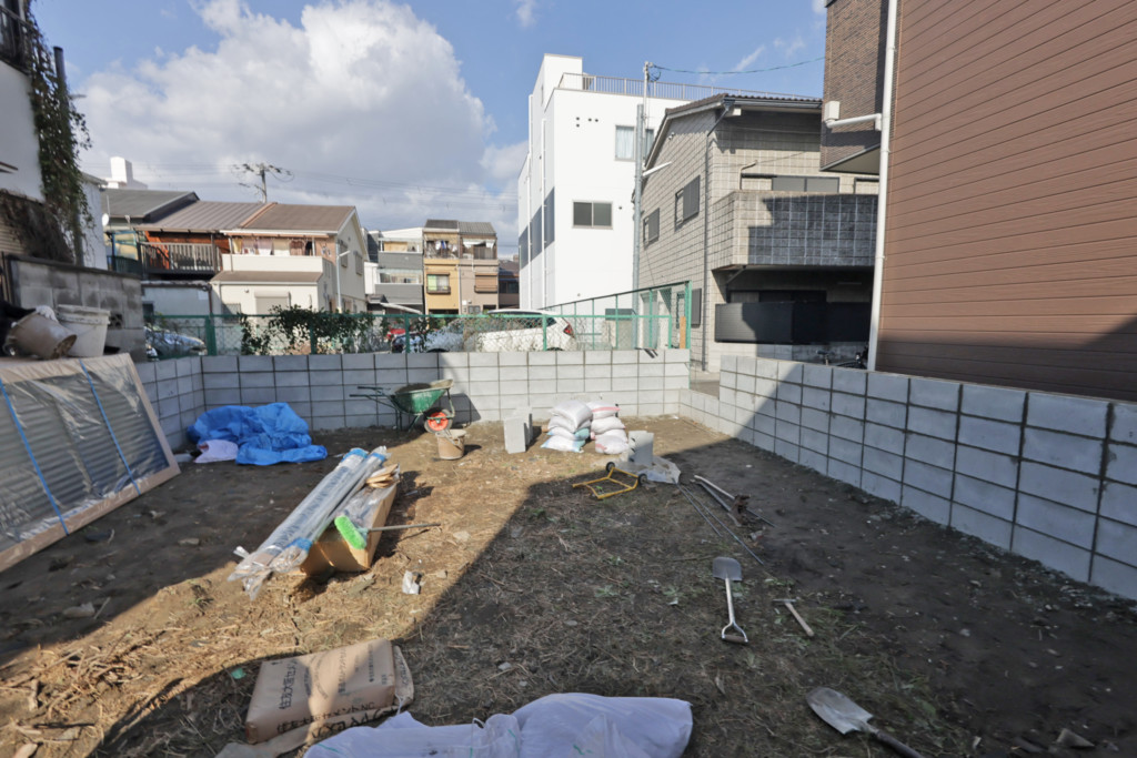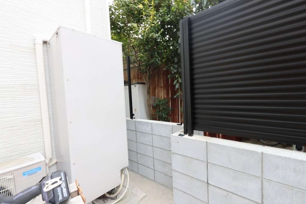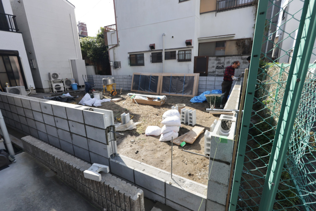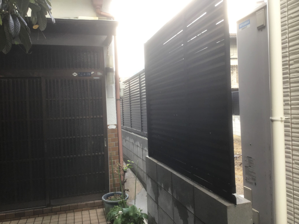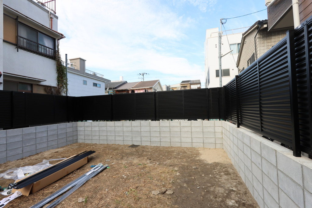 | 空地の境界部分にCB150を5段積み、四国化成・クレディフェンスHG6型H1200を設置し、完全に目隠しにしたいとの事でブロックとフェンスの隙間もアンダーカバーで塞ぎました。境界を出す為に、施工前に測量士を入れ、境界ポイントを出してから施工しております。 |