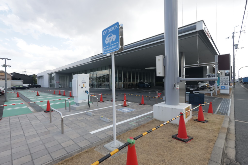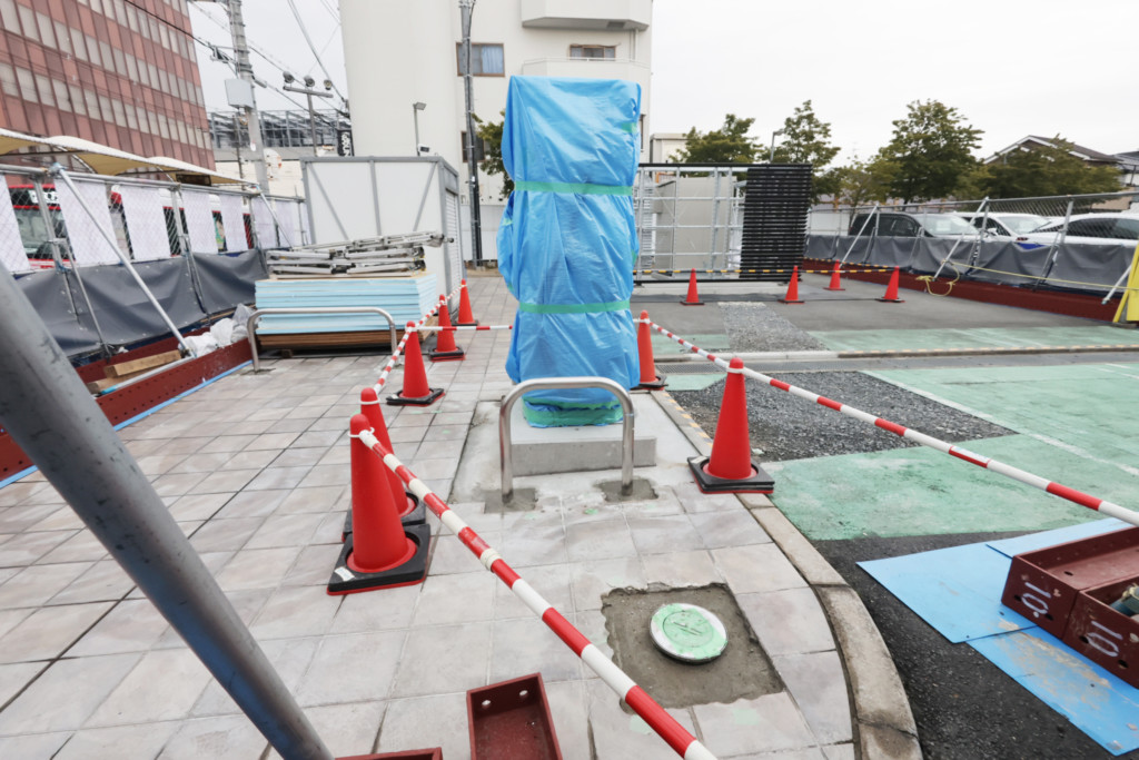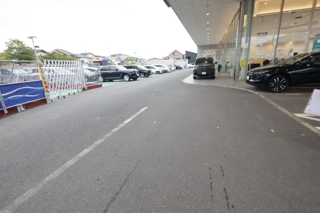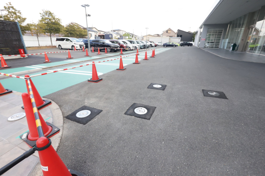 | 車屋さんの出入り口部分に帝金バリカークサリ内臓式(φ165)・U字バリカー他、標識・地面には加熱溶融タイプのシート、車止め等、設置しました。 |
