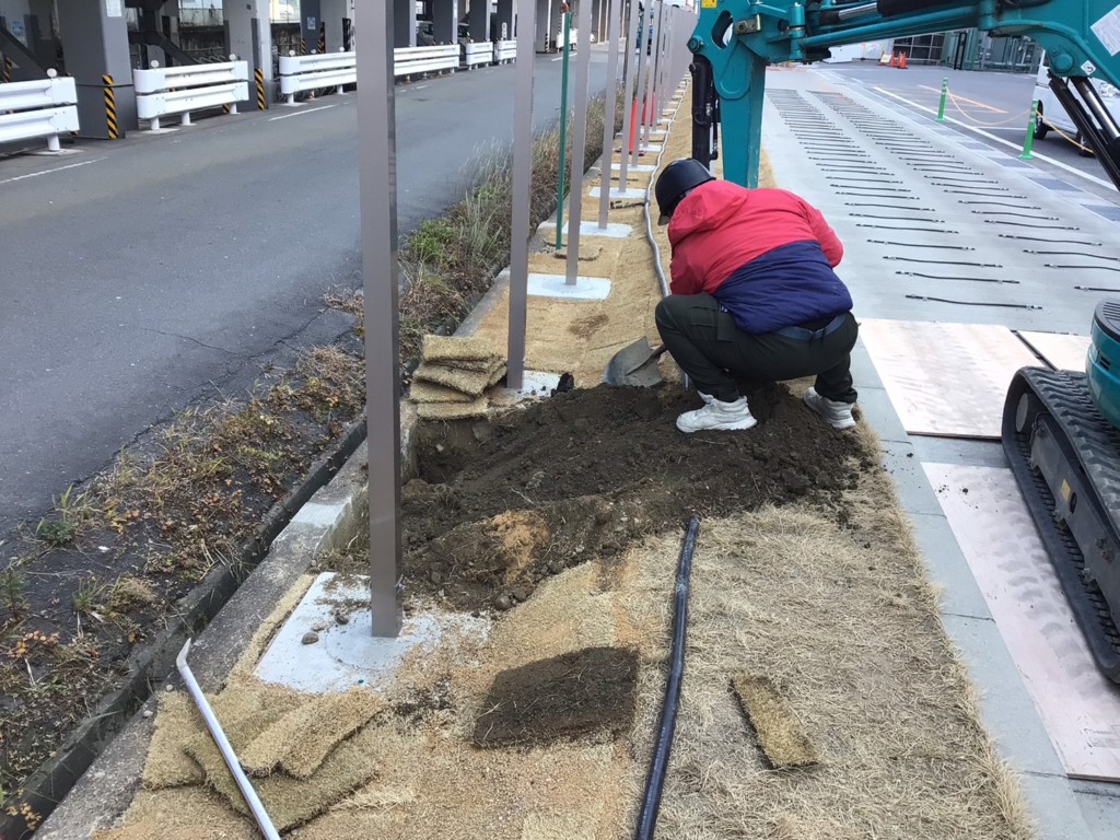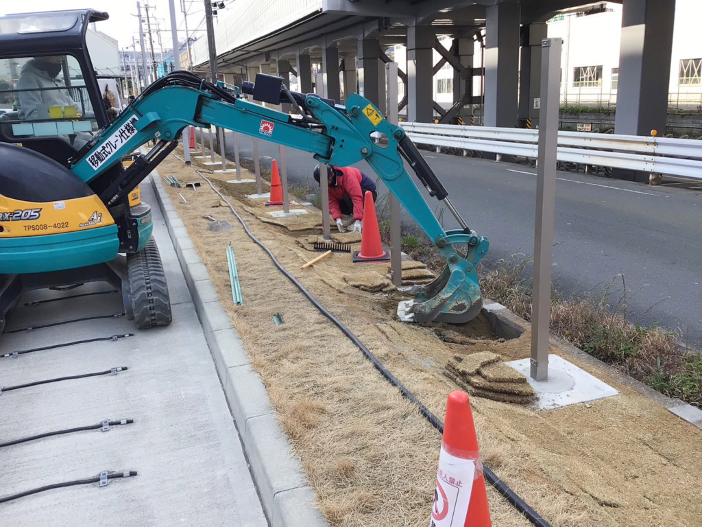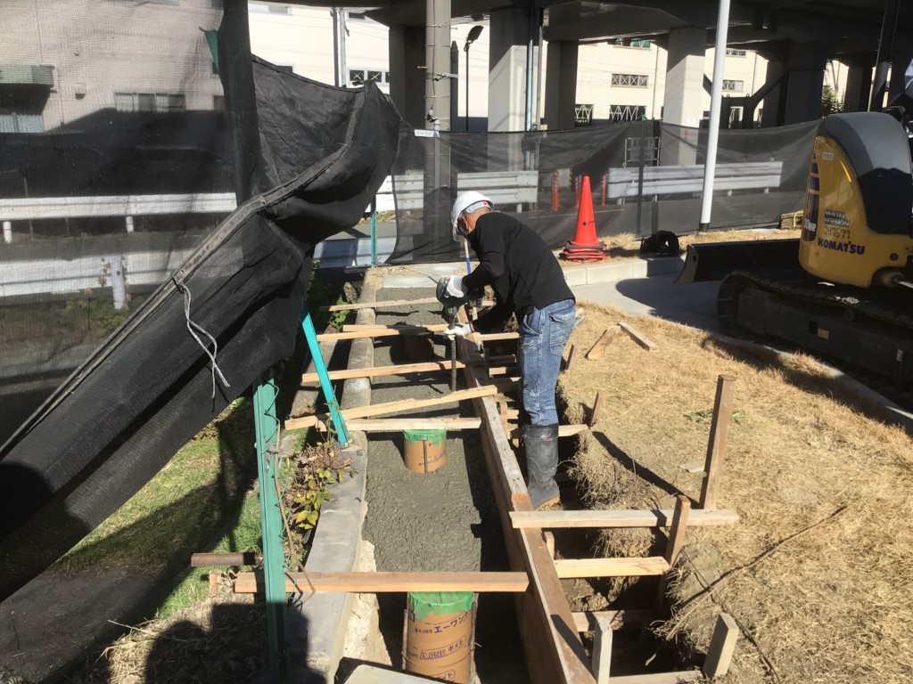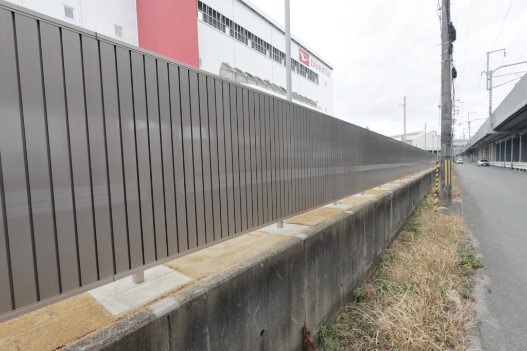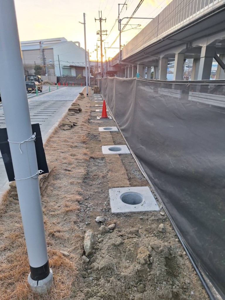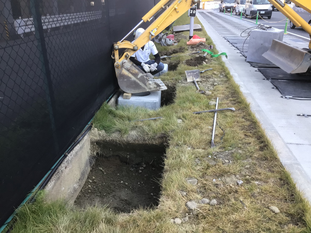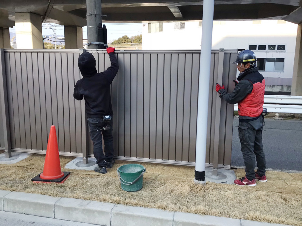 | 会社の既存のネットフェンスを撤去し、四国化成・ルーバーフェンスGTF8型を設置しました。基礎が650角×H600の大きな基礎を設置、芝生の復旧まで施工しました。 |