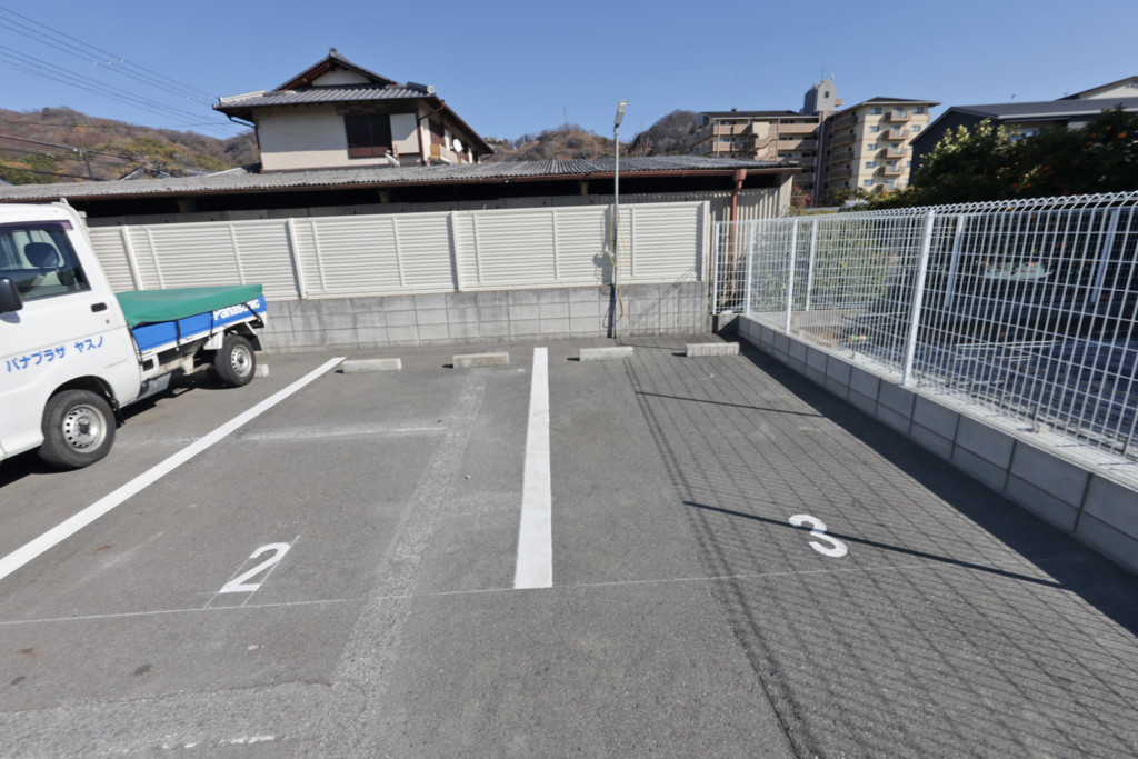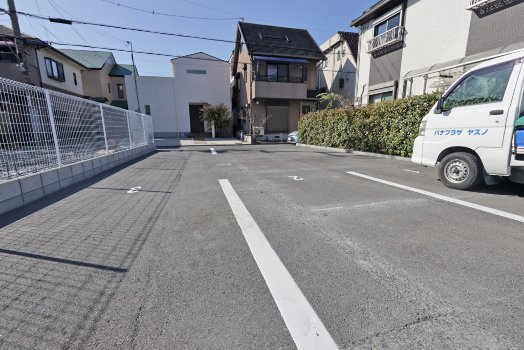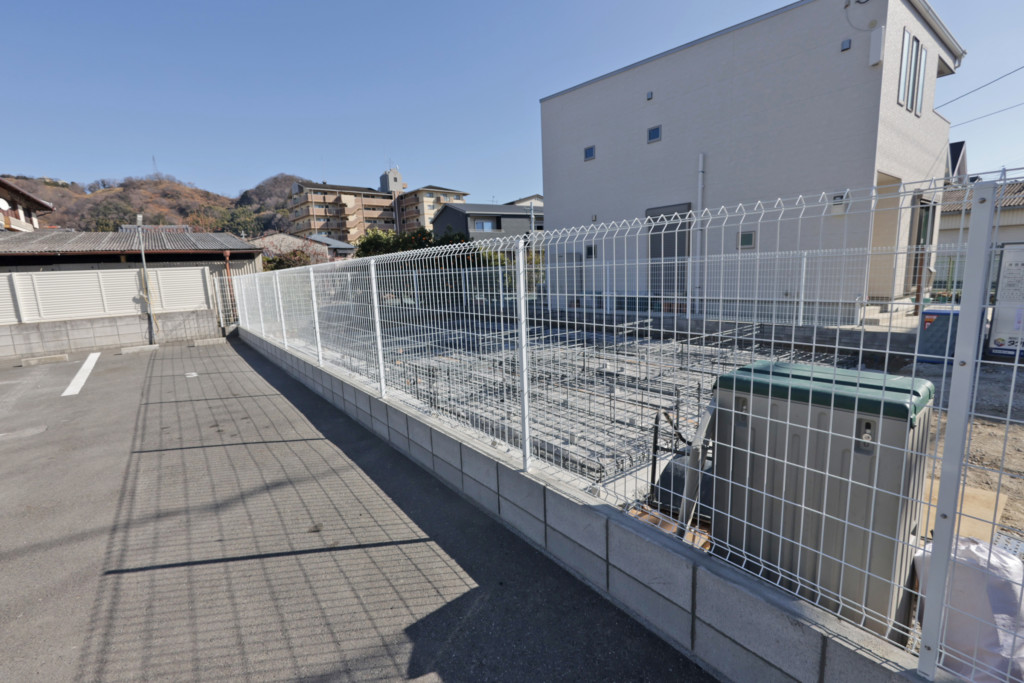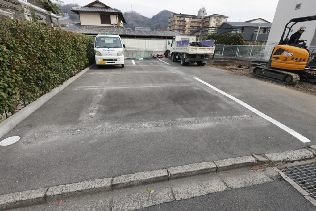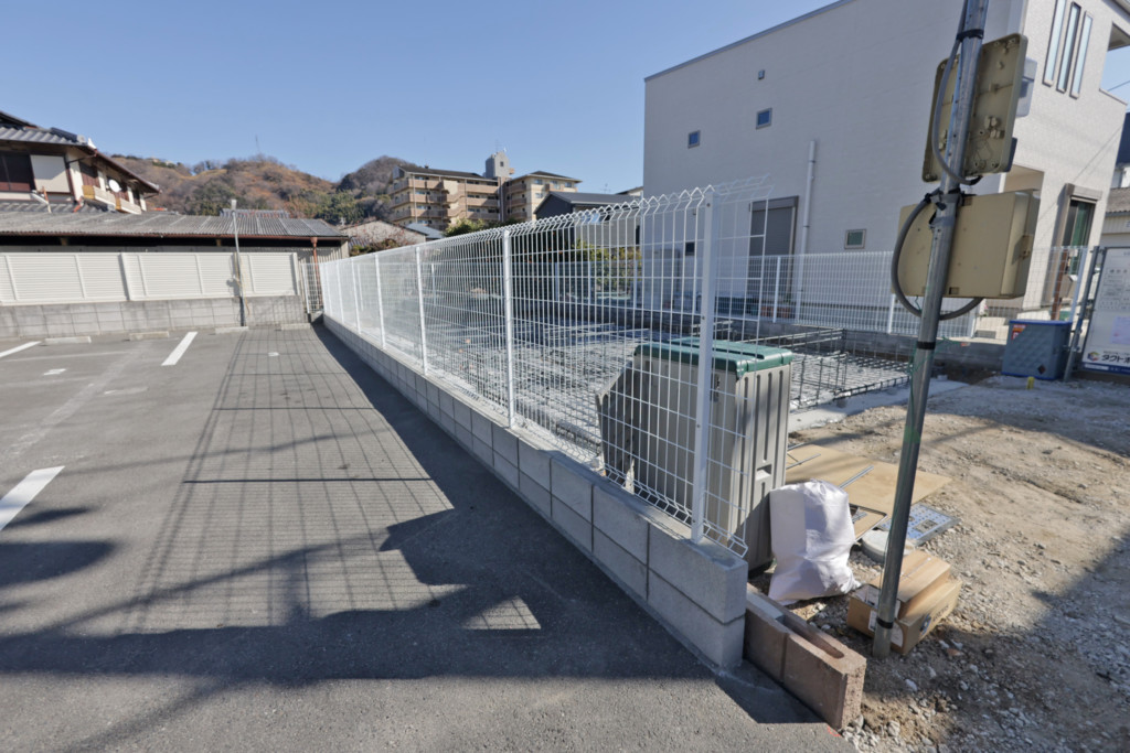月極パーキングの半分を仕切りにブロック塀・メッシュフェンスH1200を設置、既存のライン(区画線)を消し、新たに4台分のライン敷き、番号を施工しました。