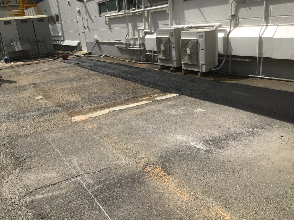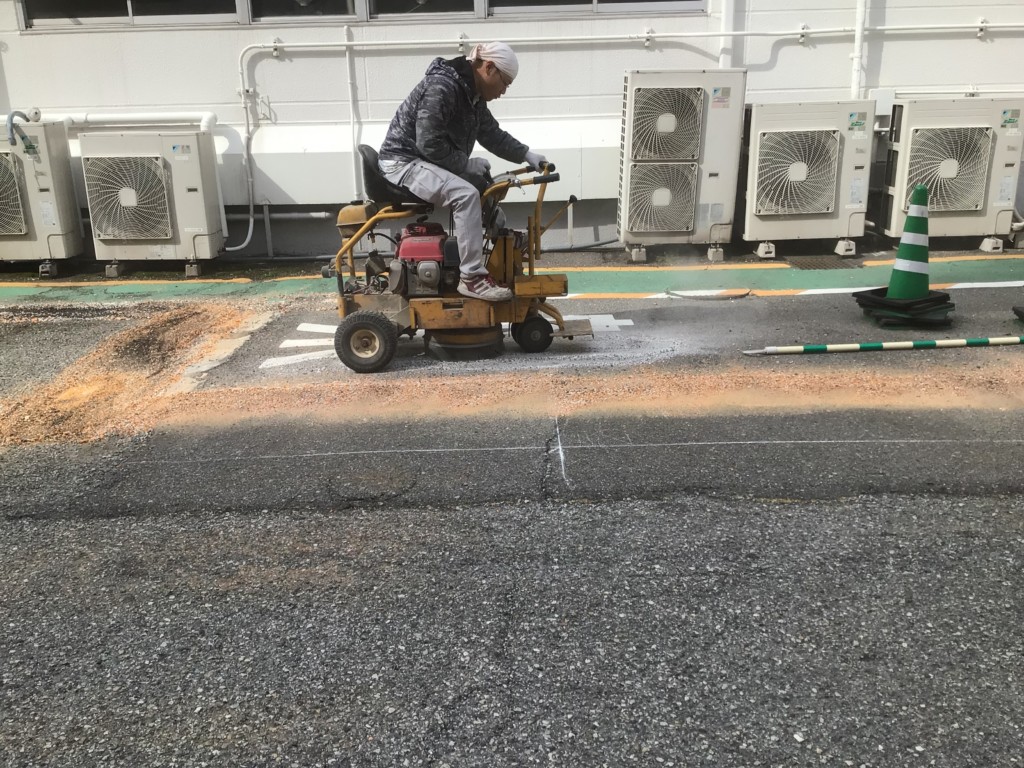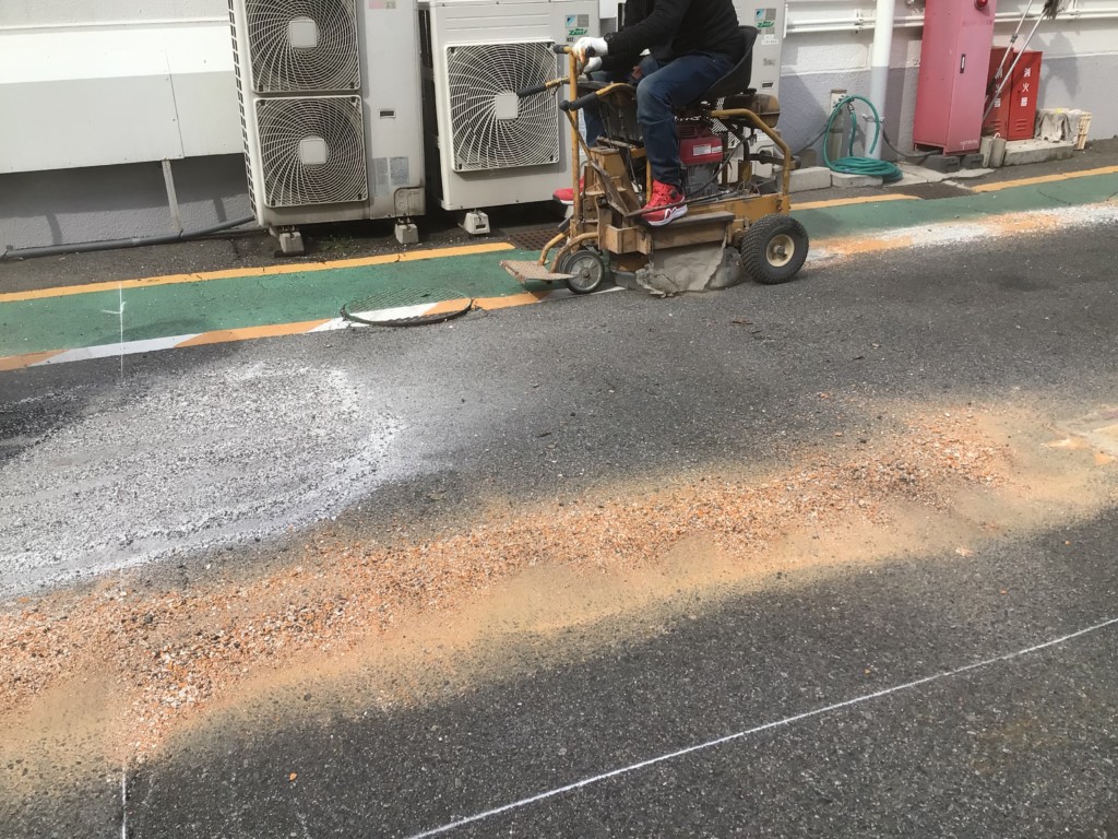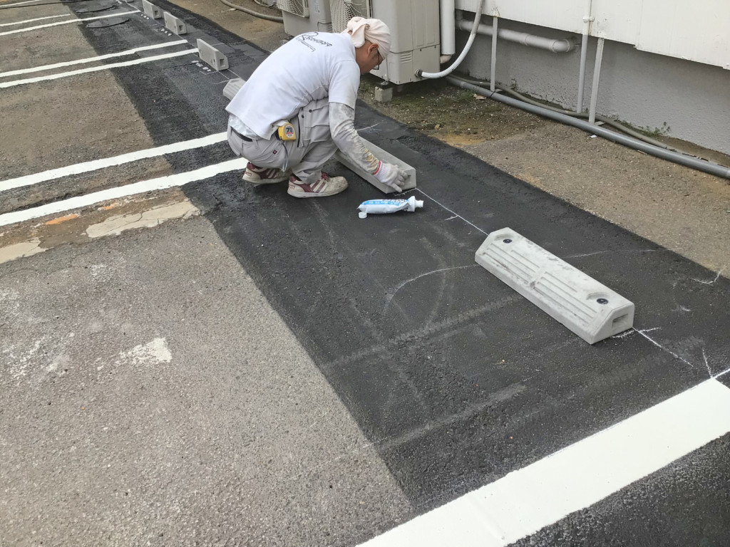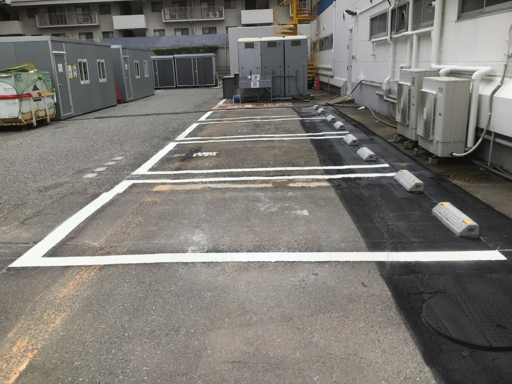 | スポーツ施設の駐車場で駐車区画の変更に伴い、不要なライン他を消し、新たにラインを敷き、車止めを設置しました。 |