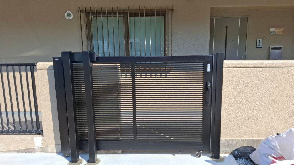 家の横の犬走り部分にネットフェンス門扉H1800・W900のネットフェンス門扉を設置しました。